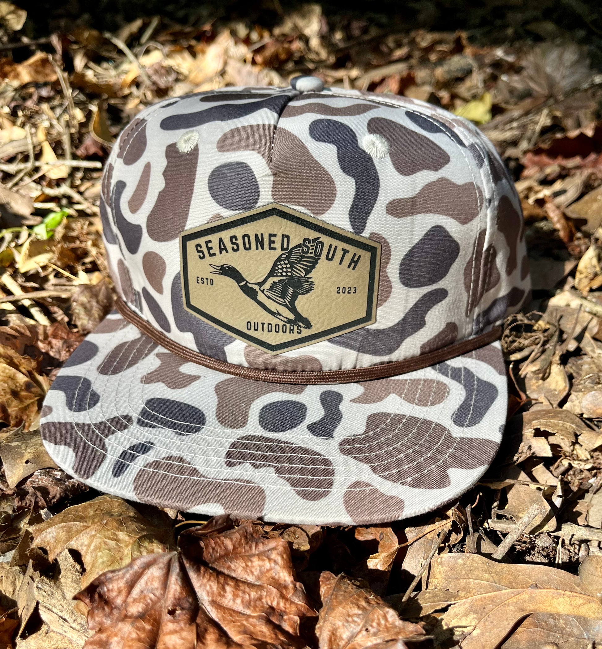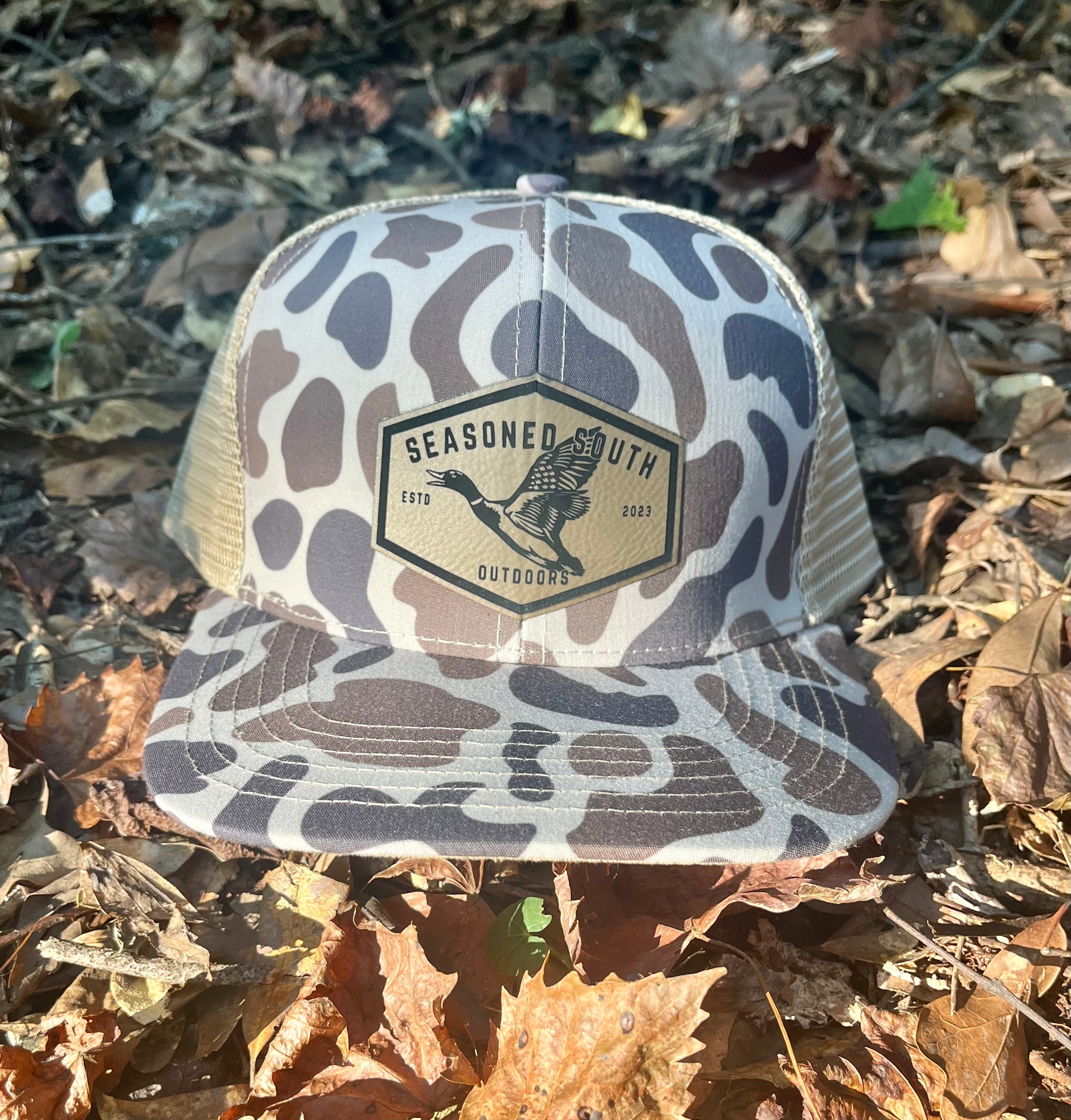 Stand out while blending in. This duck camo hat features a rugged leatherette patch with a detailed flying mallard and the Seasoned South Outdoors mark — a true nod to southern waterfowl tradition.